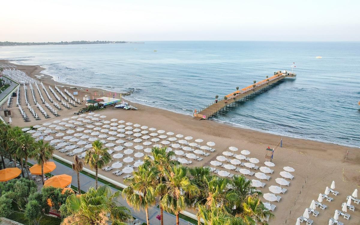 Hotel se nalazi na svojoj peščanoj plaži sa paviljonom i delom samo za odrasle. Zbog kamenja u vodi preporučuje se obuća za plažu. Upotreba ležaljki, suncobrana i peškira se dodatno ne naplaćuje.