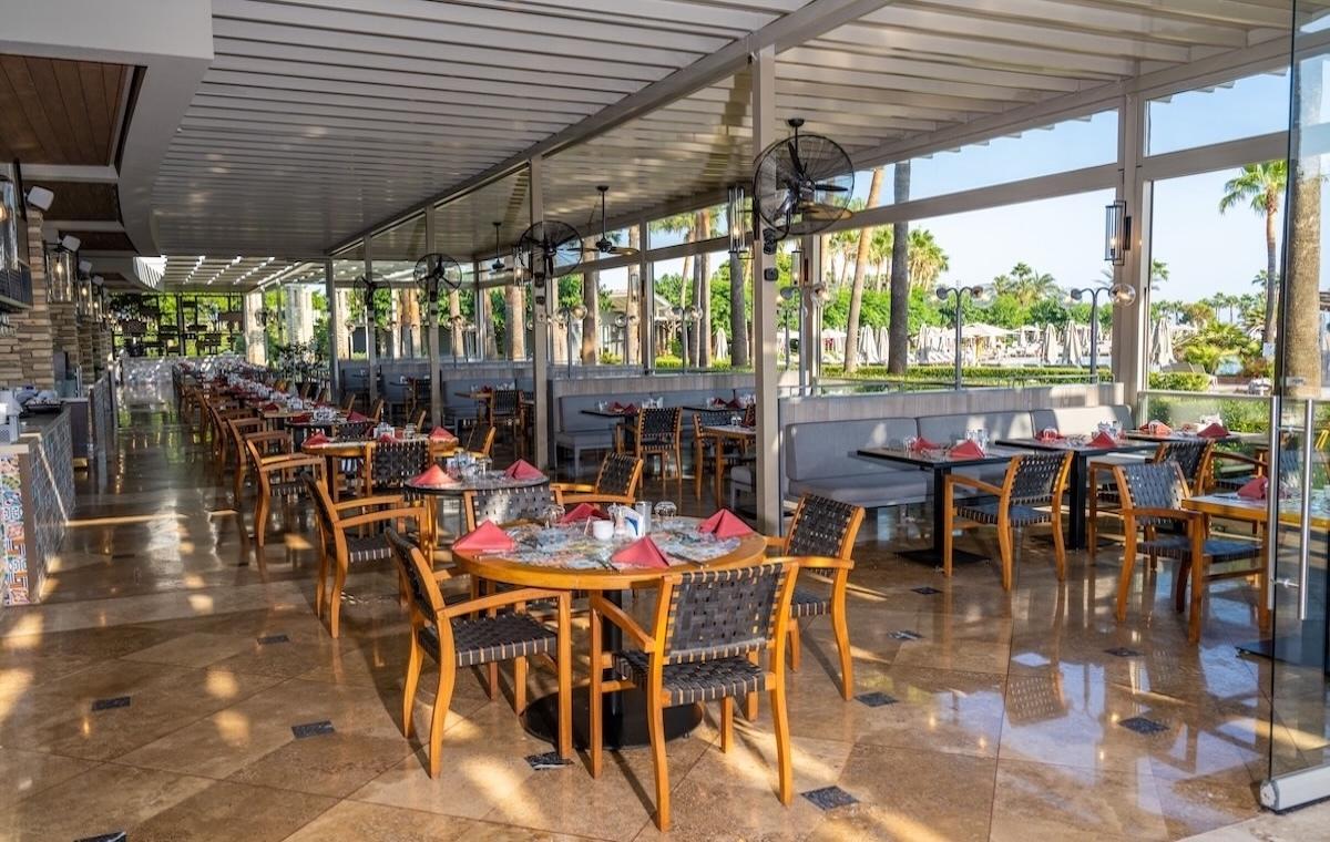 Samoposluživanje, izbor više jela po hotelskim pravilima u glavnom restoranu: doručak, à la carte doručak, kasni doručak, ručak, večera, ponoćna užina, kolači, užine u različito doba dana, lokalna alkoholna i bezalkoholna pića, kokteli, restoran (jednom nedeljno uz rezervaciju dan unapred). U restoranu „Akdeniz“ nije dozvoljen ulaz deci do 12 godina.